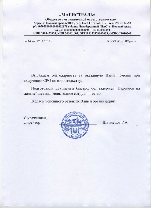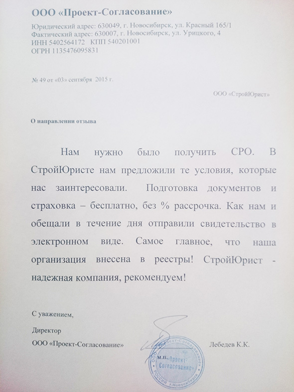 Отзывы клиентов "СтройЮрист" по вступлению в СРО в Братске
