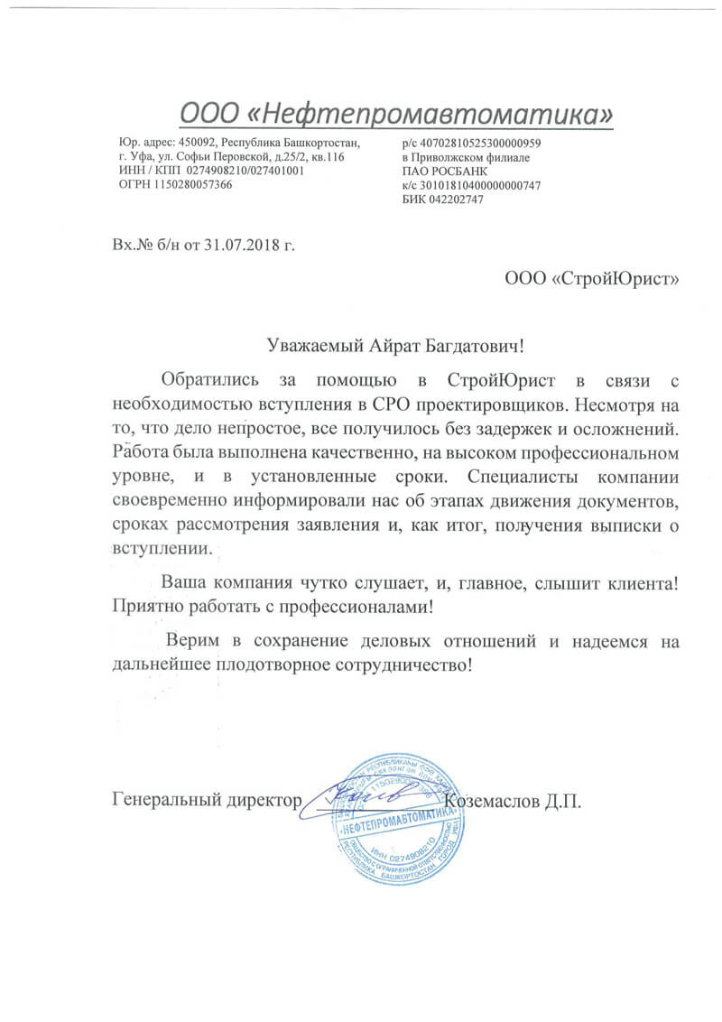 Отзывы клиентов "СтройЮрист" по вступлению в СРО в Братске